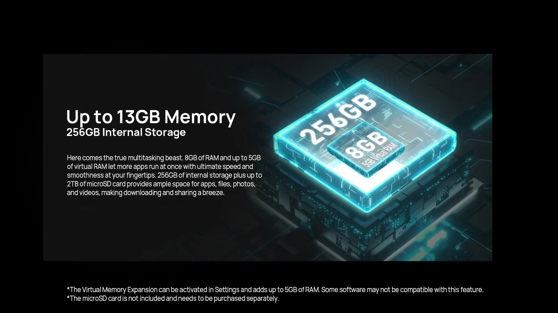 3. The Virtual Memory Expansion can be activated in Settings and adds up to 5GB of RAM. Some software may not be compatible with this feature.