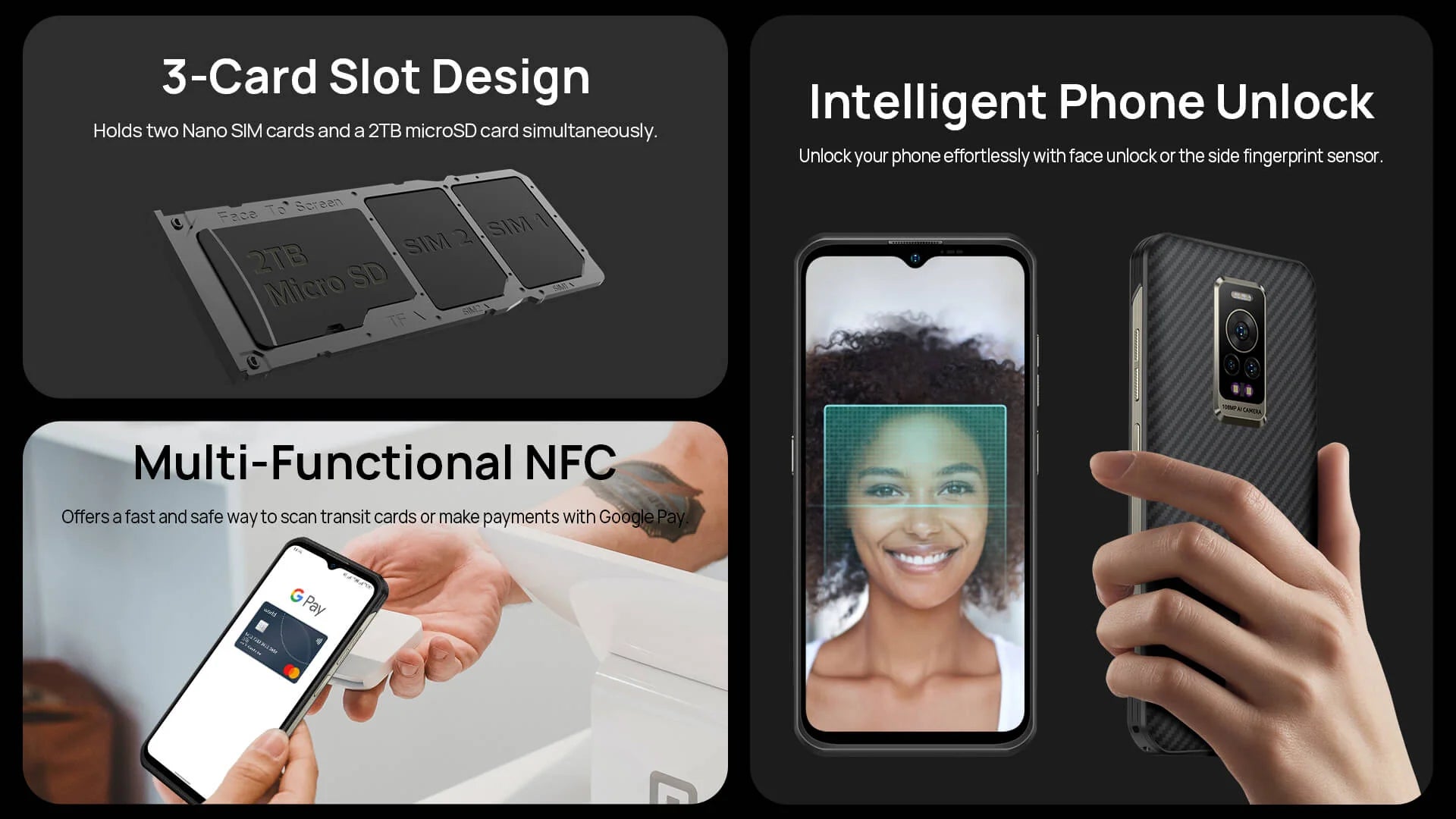 - NFC: Supports Google Pay, Supports Transit, Loyalty Cards, Gift Cards, and Plane tickets