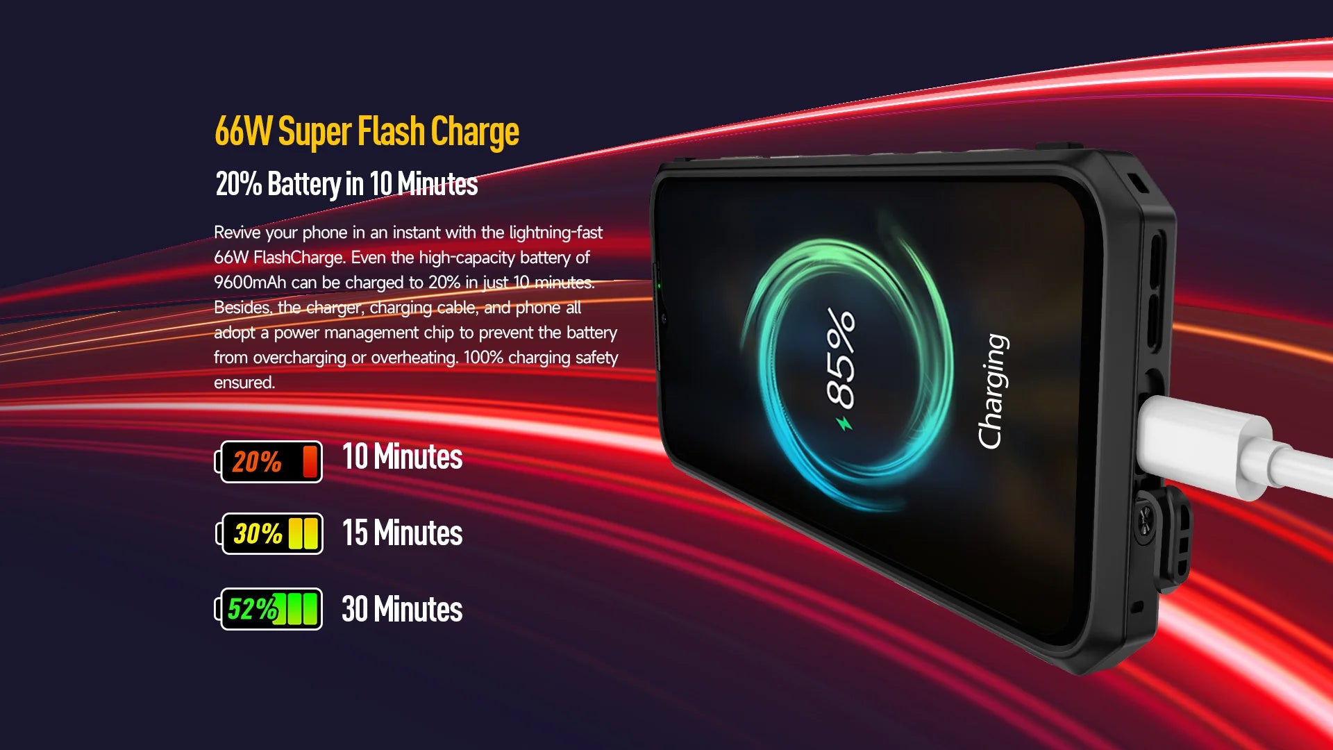 2. 66W is the max charging power when using with original charger and data cable. Data are from Ulefone labs. The actual charging power and charging time may vary depending on the specific conditions, please refer to the actual usage situations.