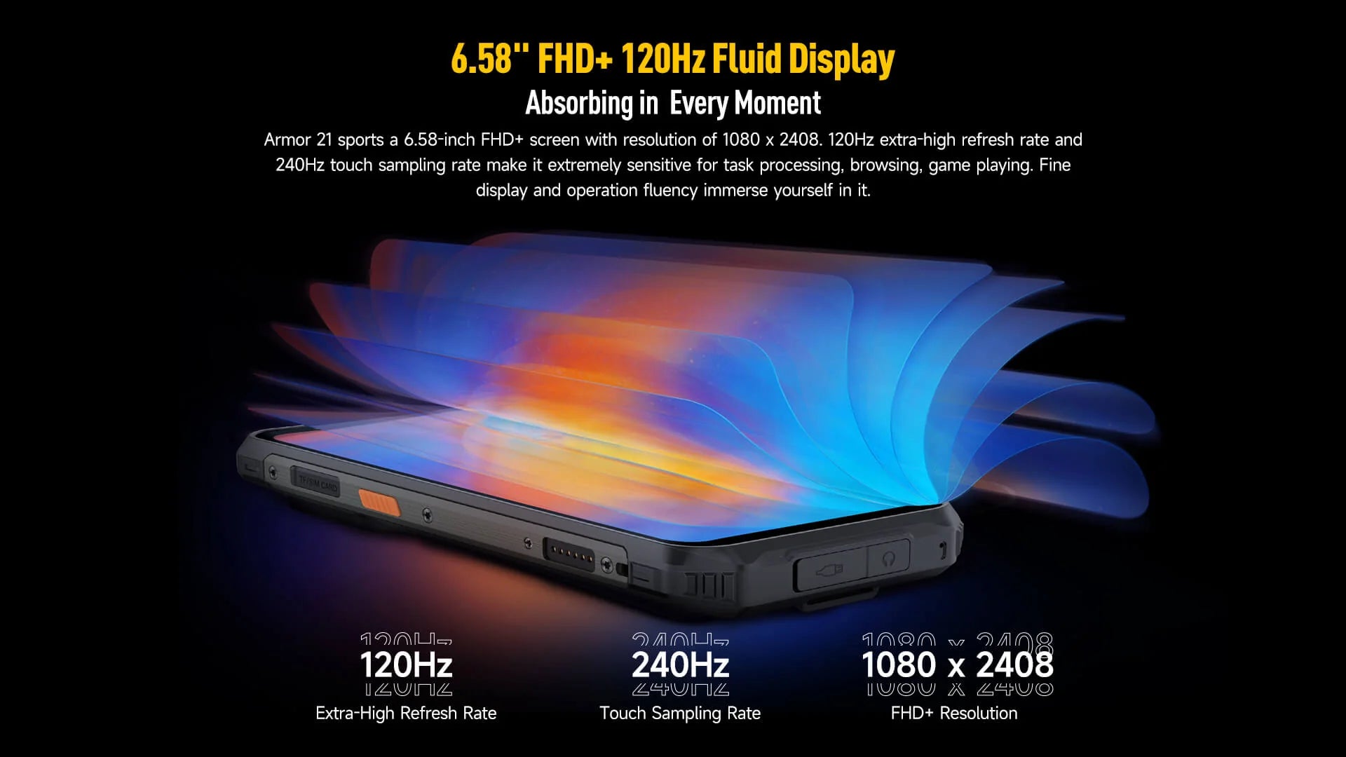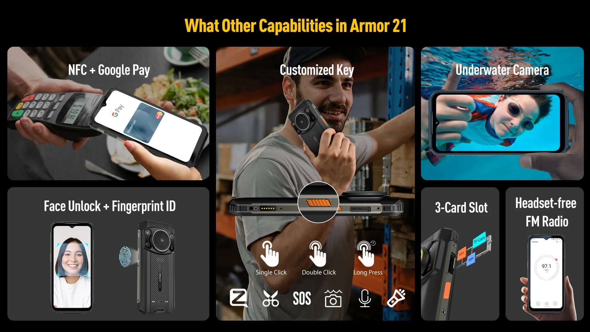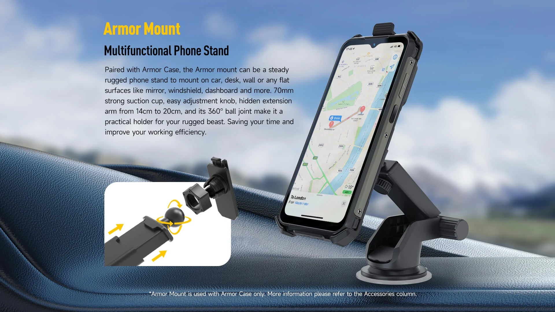 Together with 8GB of RAM + 8GB Virtual RAM, 256GB internal storage and 2TB expanded storage space, Armor 21 runs without latency, enhancing working efficiency.