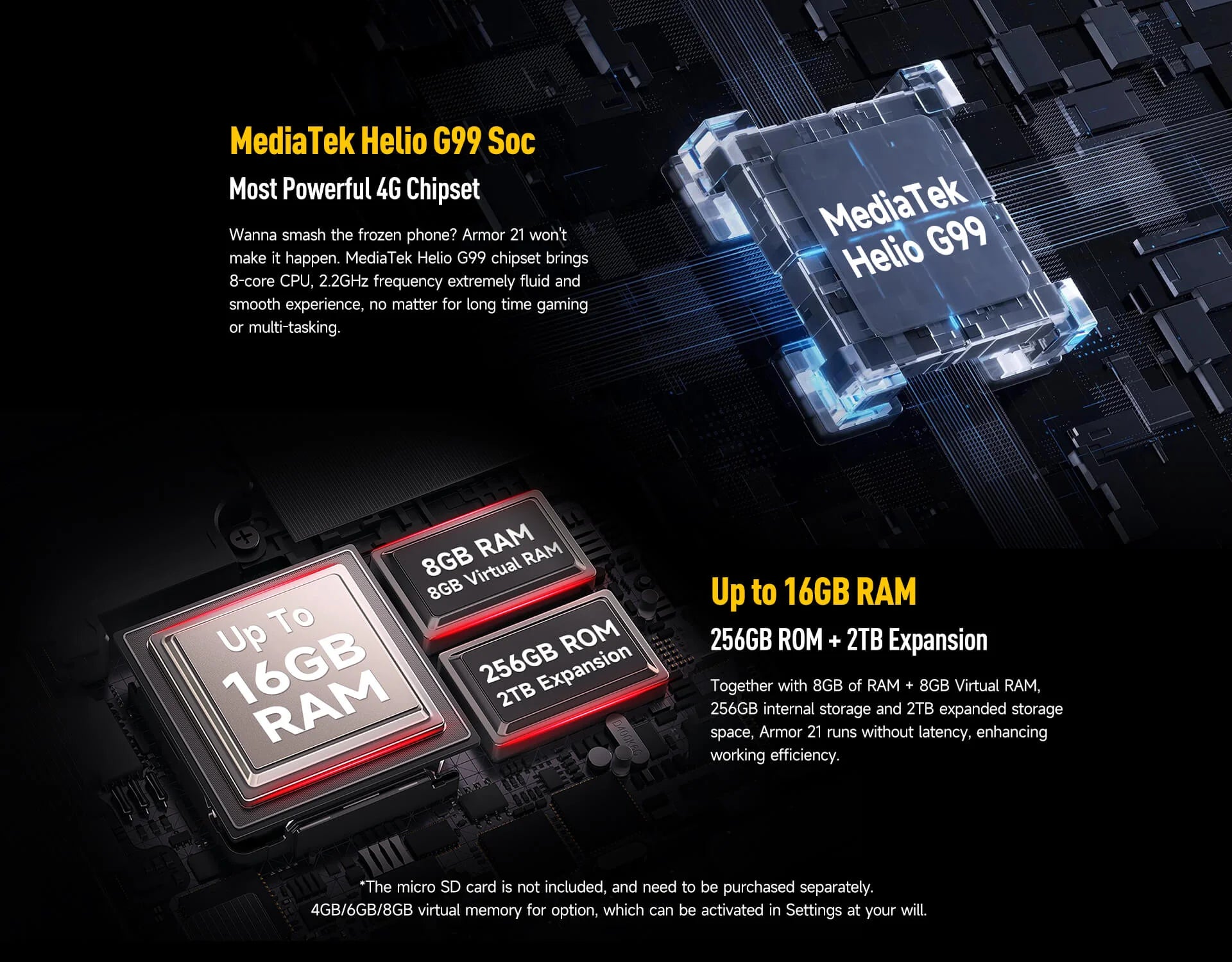Wanna smash the frozen phone? Armor 21 won't make it happen. MediaTek Helio G99 chipset brings 8-core CPU, 2.2GHz frequency extremely fluid and smooth experience, no matter for long time gaming or multi-tasking.