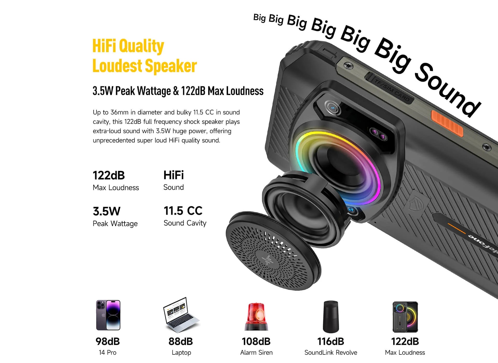 Up to 36mm in diameter and bulky 11.5 CC in sound cavity, this 122dB full-frequency shock speaker plays extra-loud sound with 3.5W huge power, offering unprecedented super loud HiFi quality sound.